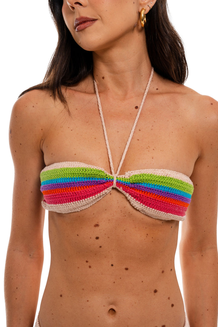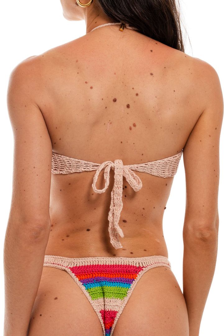 Biquini feito à mão em crochê, com estampa de listras coloridas.