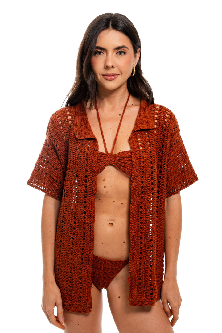 Biquini de lacinho feito à mão em crochê, na linha cor terracota.