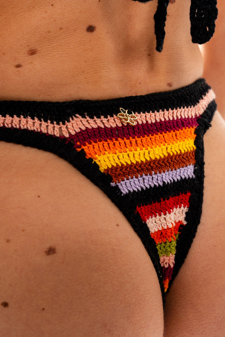 Biquini feito à mão em crochê, com estampa de listras coloridas.