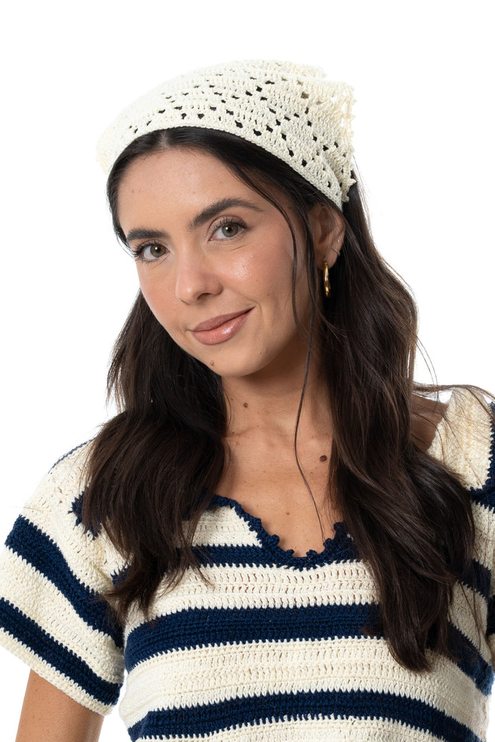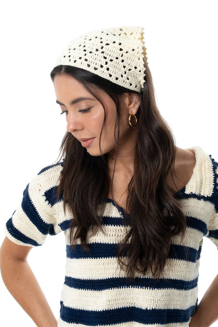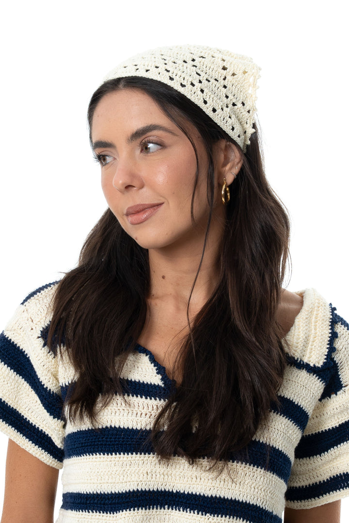 Acessório de cabeça feito à mão em crochê na linha 100% algodão na cor off white.