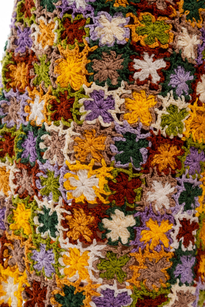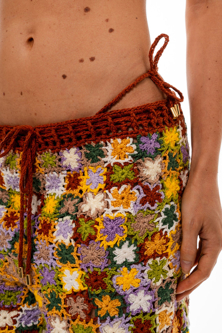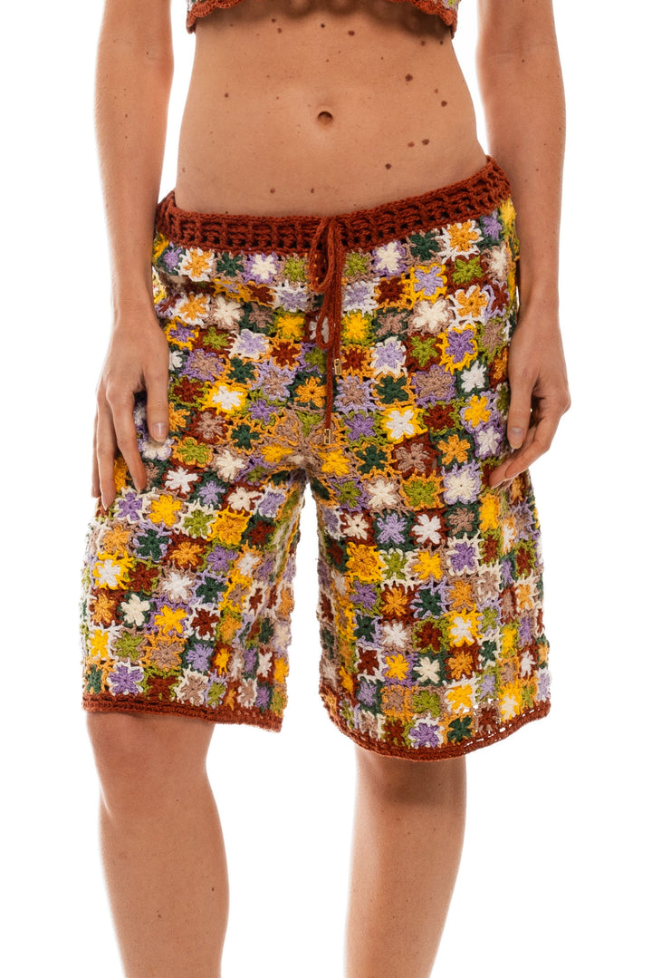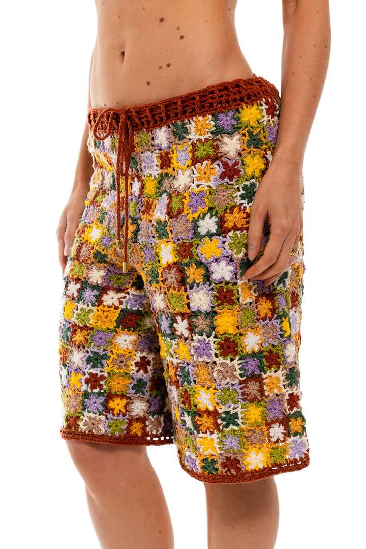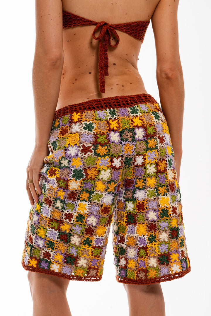 Bermuda feita à mão em crochê, composta por mini flores coloridas costuradas uma a uma manualmente.