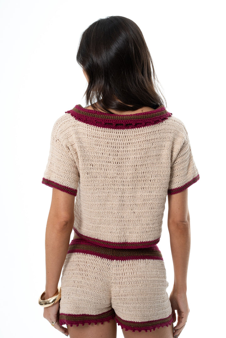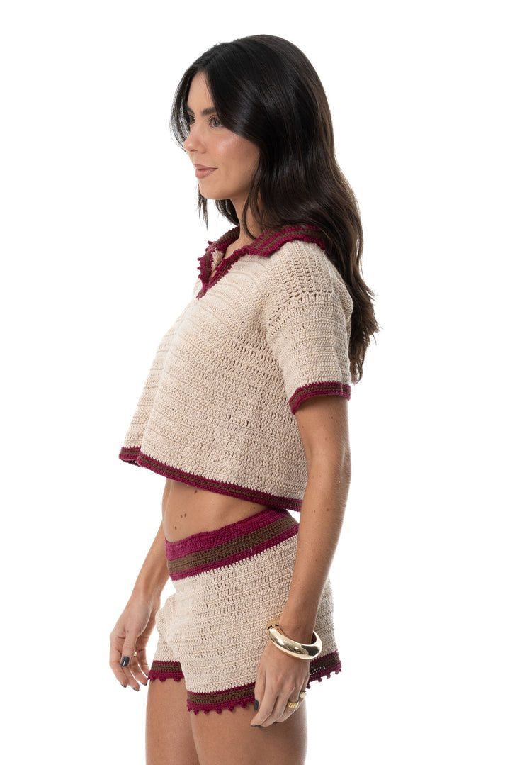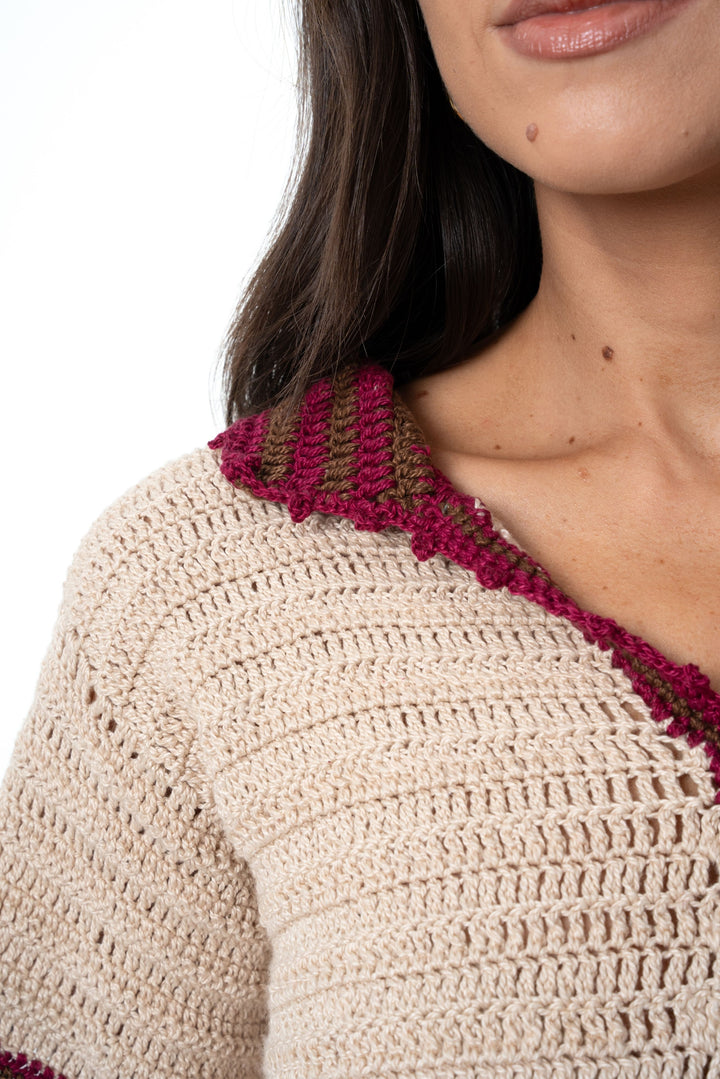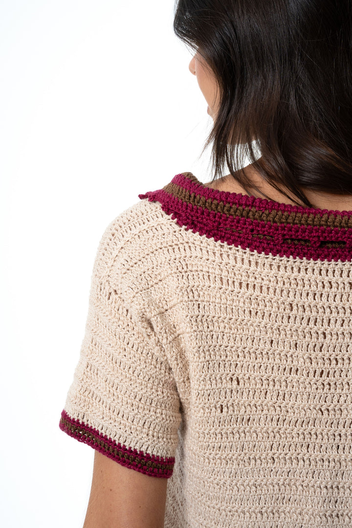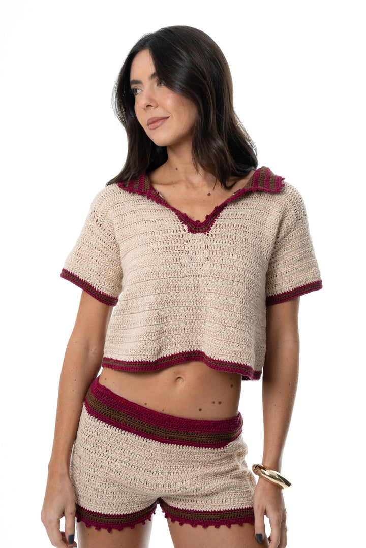 Blusa feita à mão em crochê, com mangas curtas e gola polo. A blusa é feita na linha cor bege e o acabamento da gola e mangas nas cores marsala e marrom.