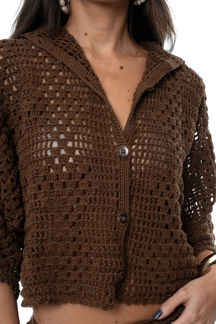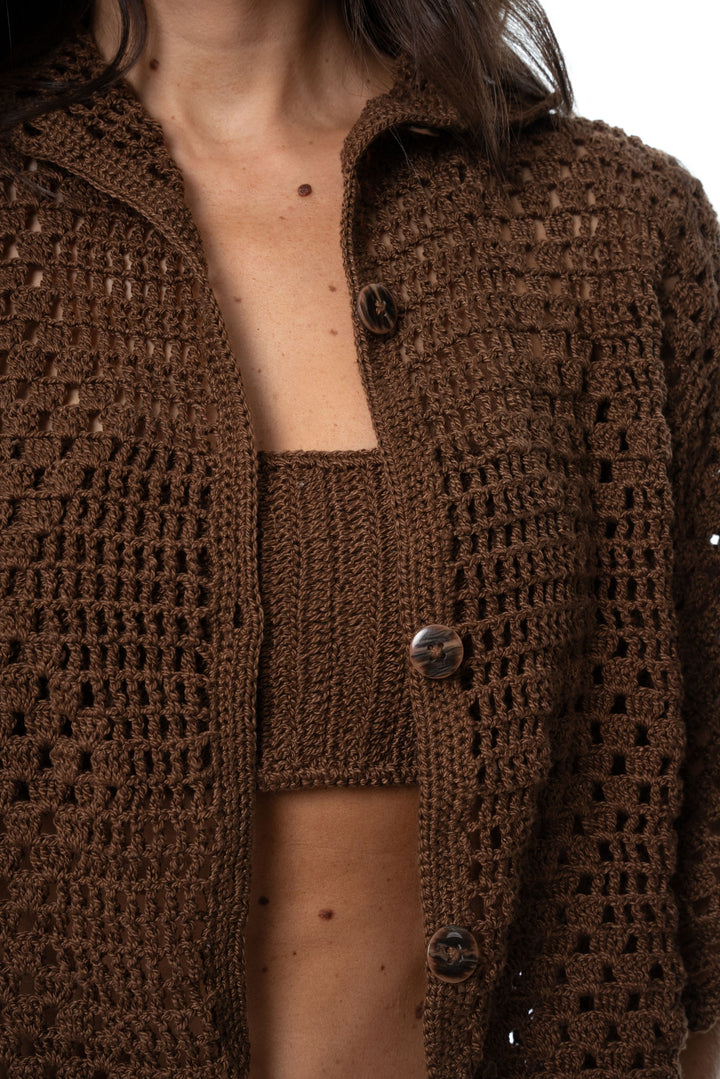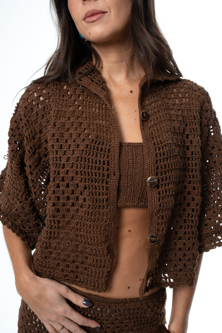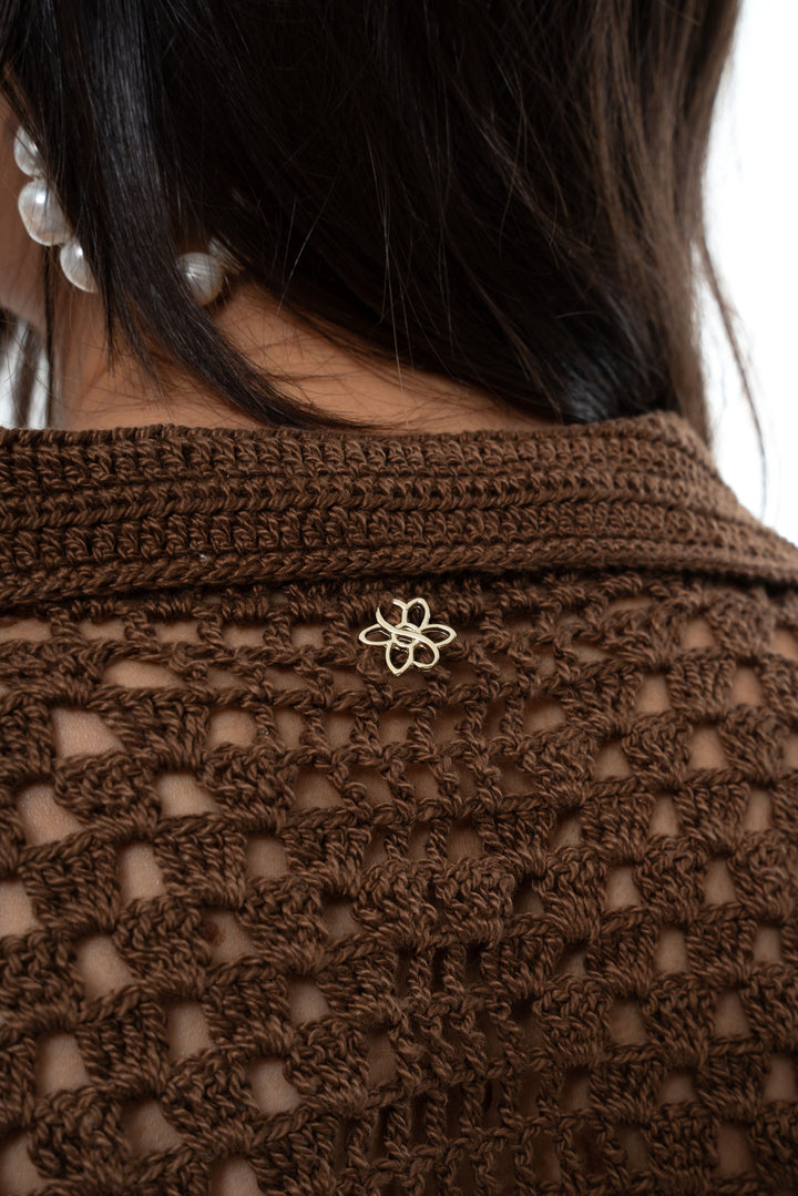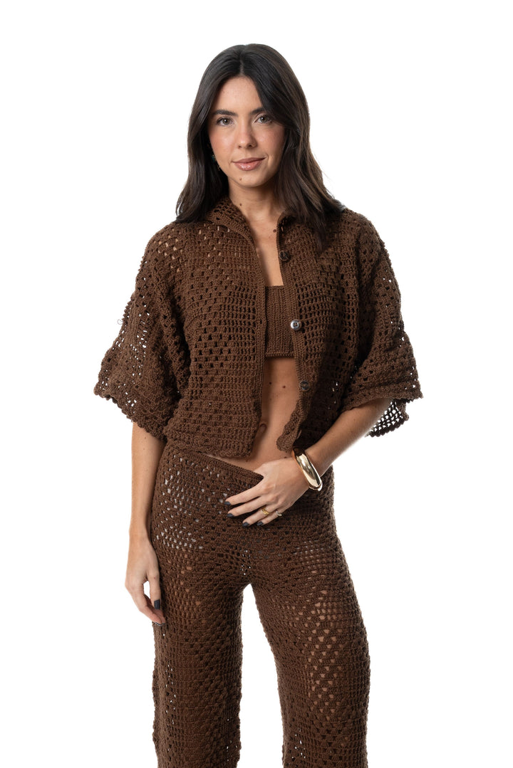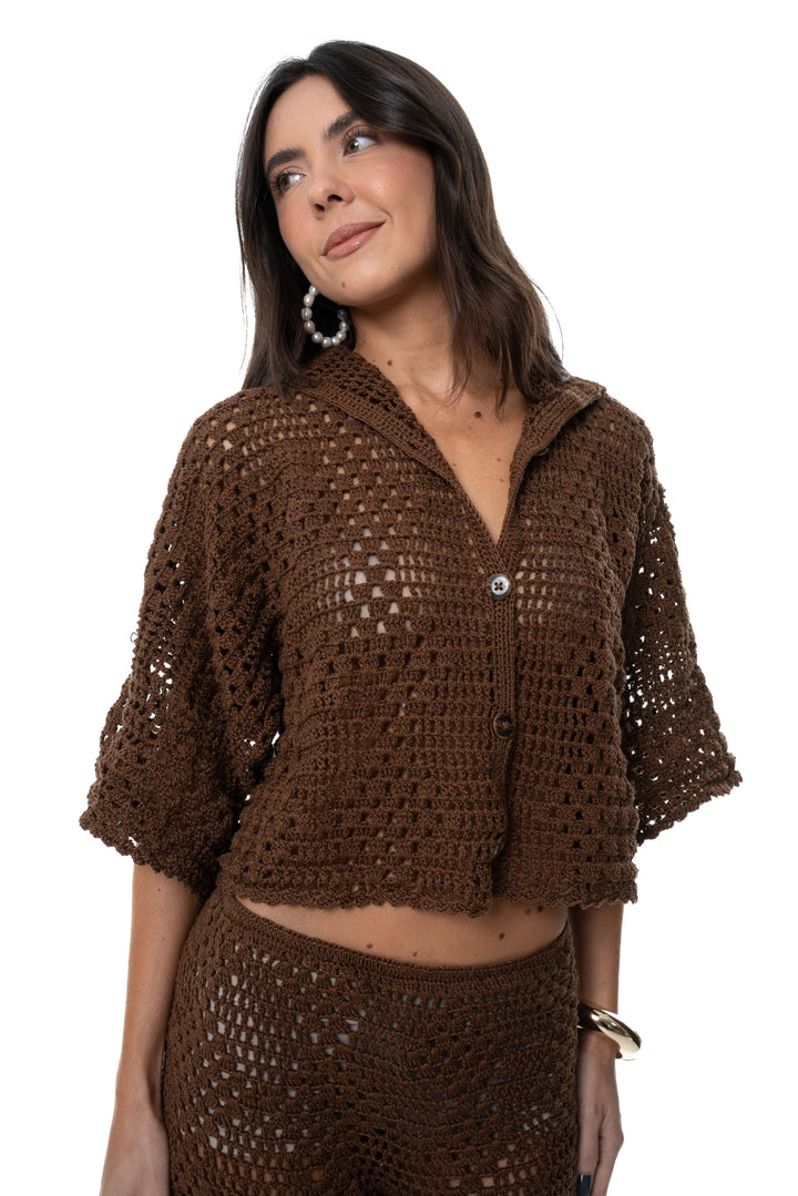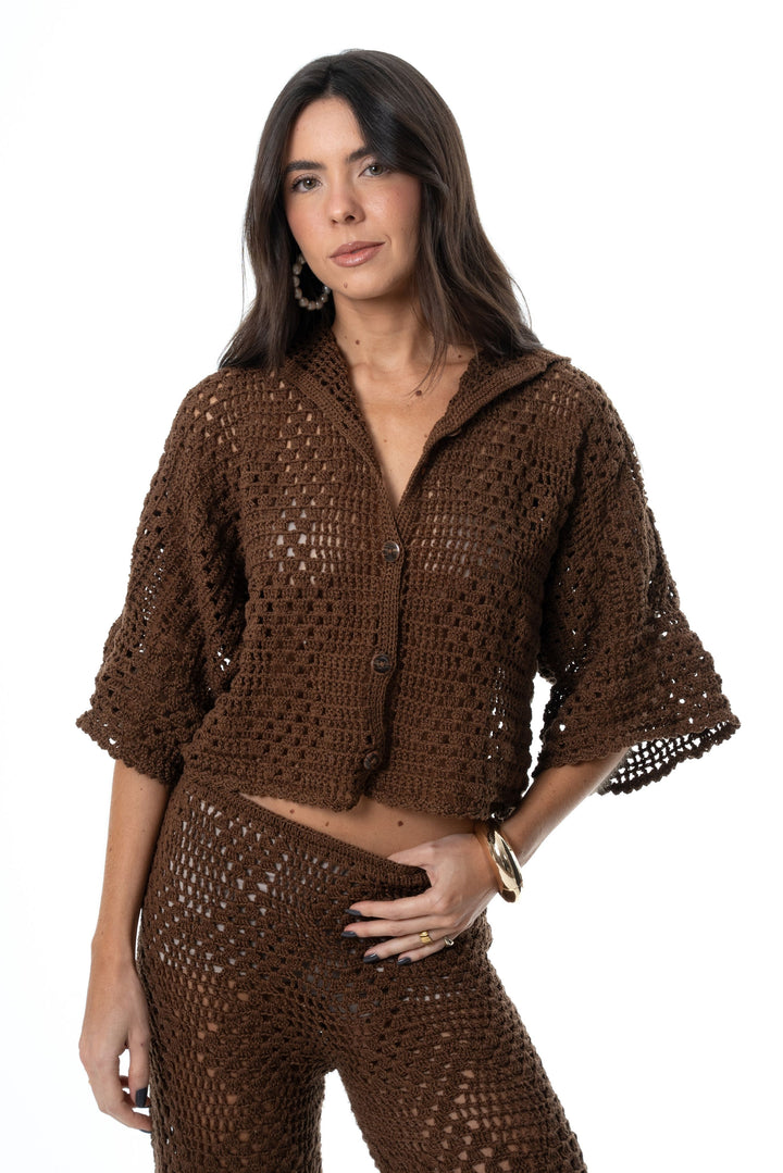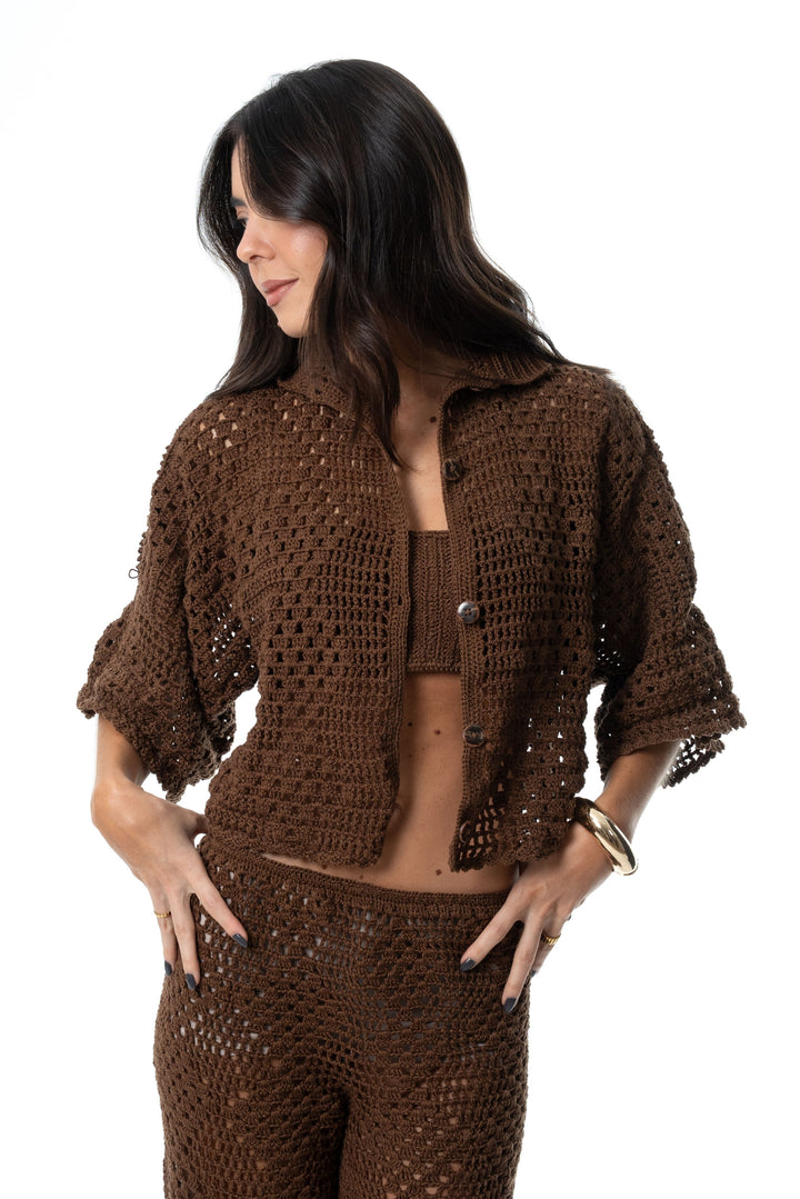A peça é feita na linha cor marrom e a trama possui formato de delicados losangos.