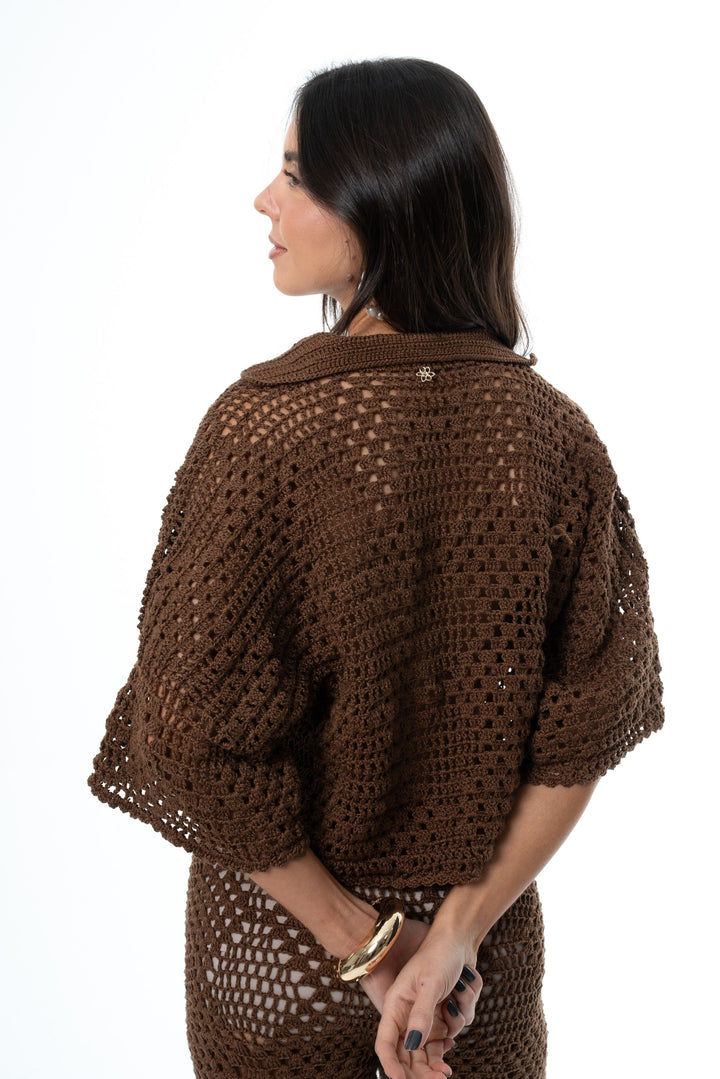 Blusa feita à mão em crochê, com mangas abaixo do cotovelo e gola polo.