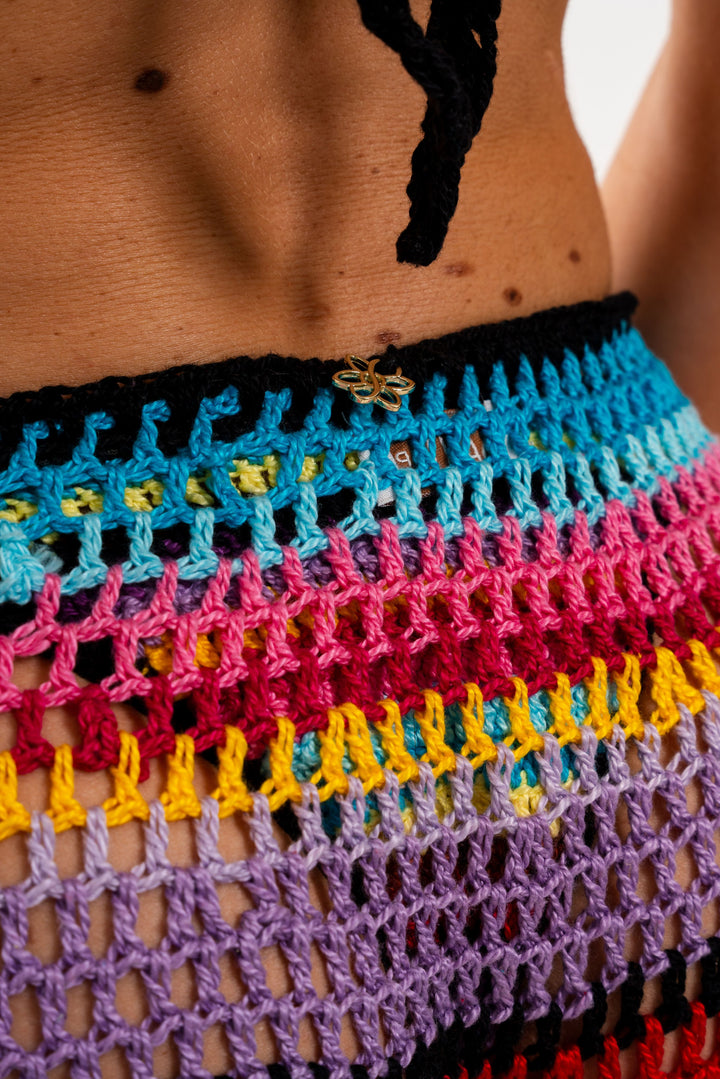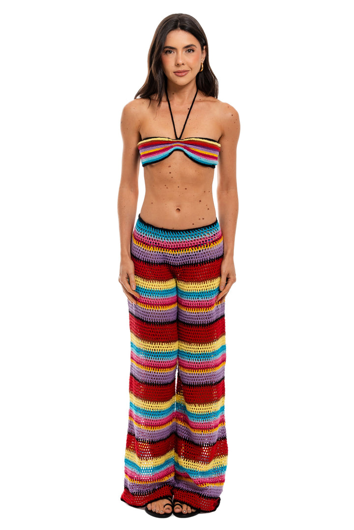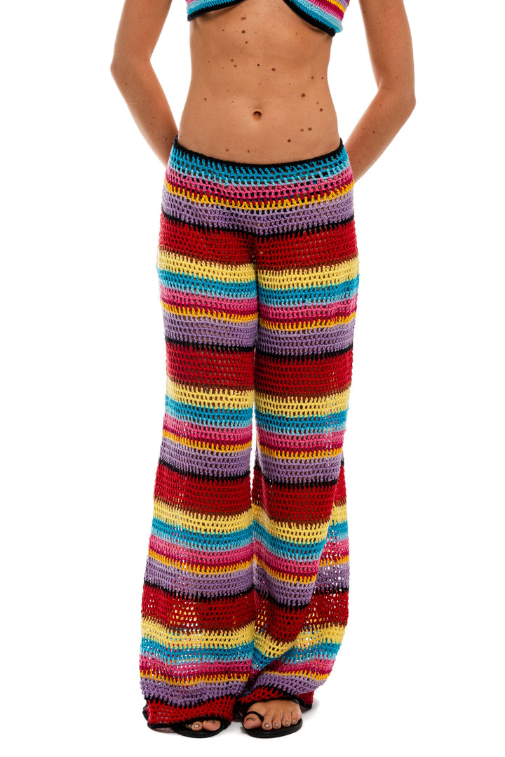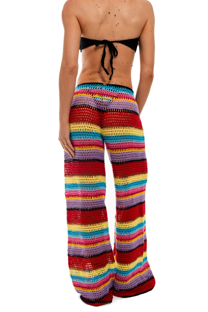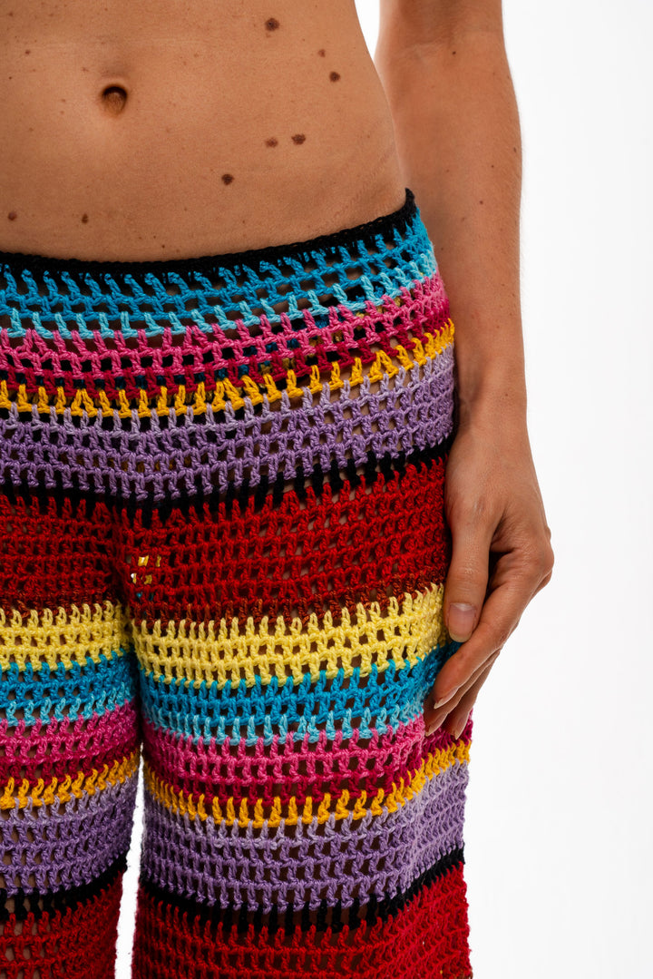 Calça feita à mão em crochê, com modelagem ampla e estampa de listras coloridas.