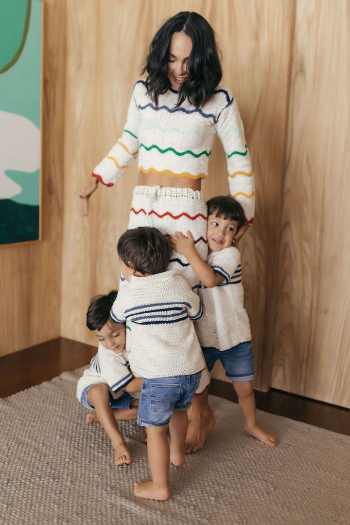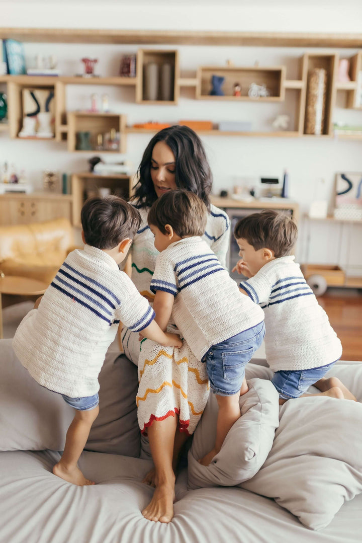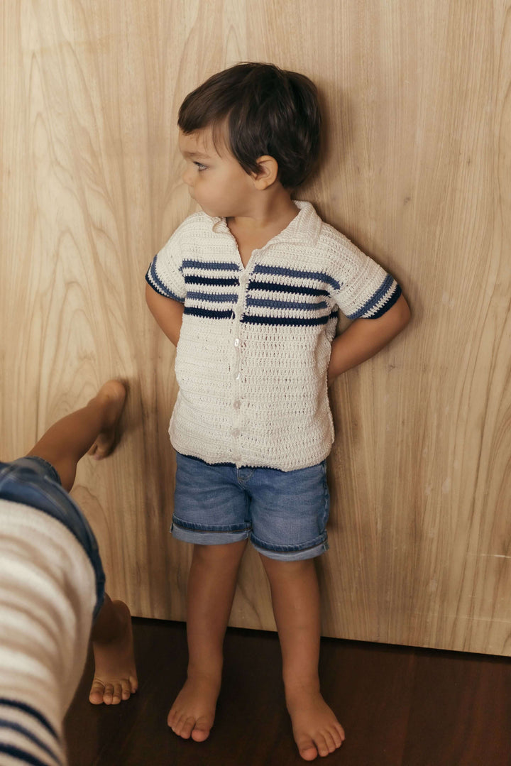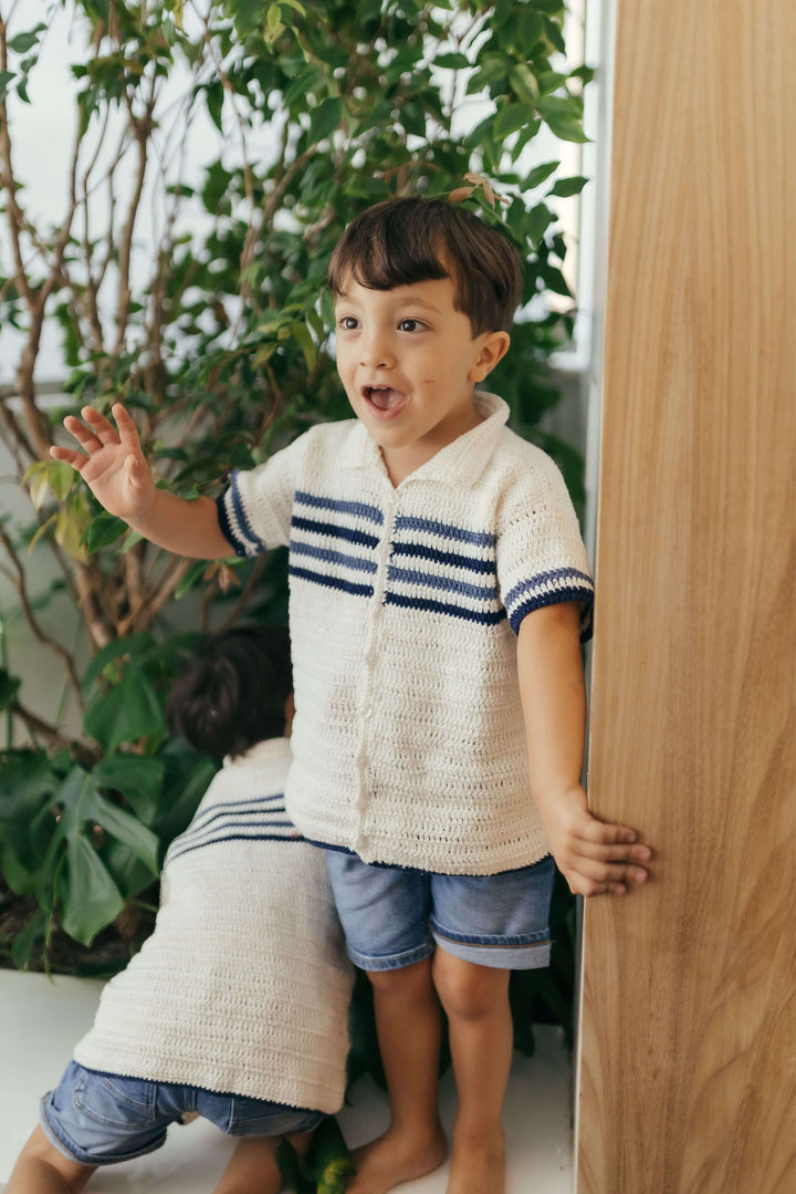 A Camisa Waves é feita à mão em crochê, em linha 100% algodão off white, com listras em tons de azul.