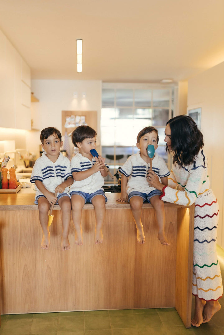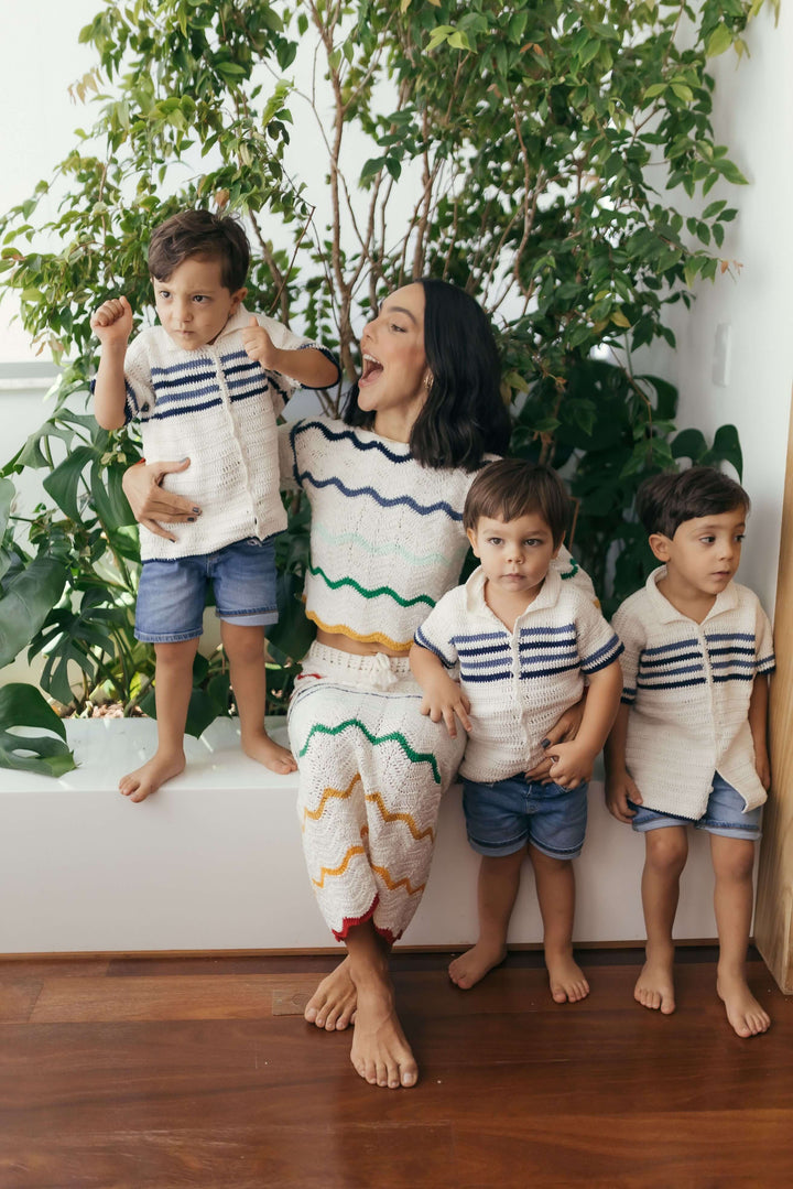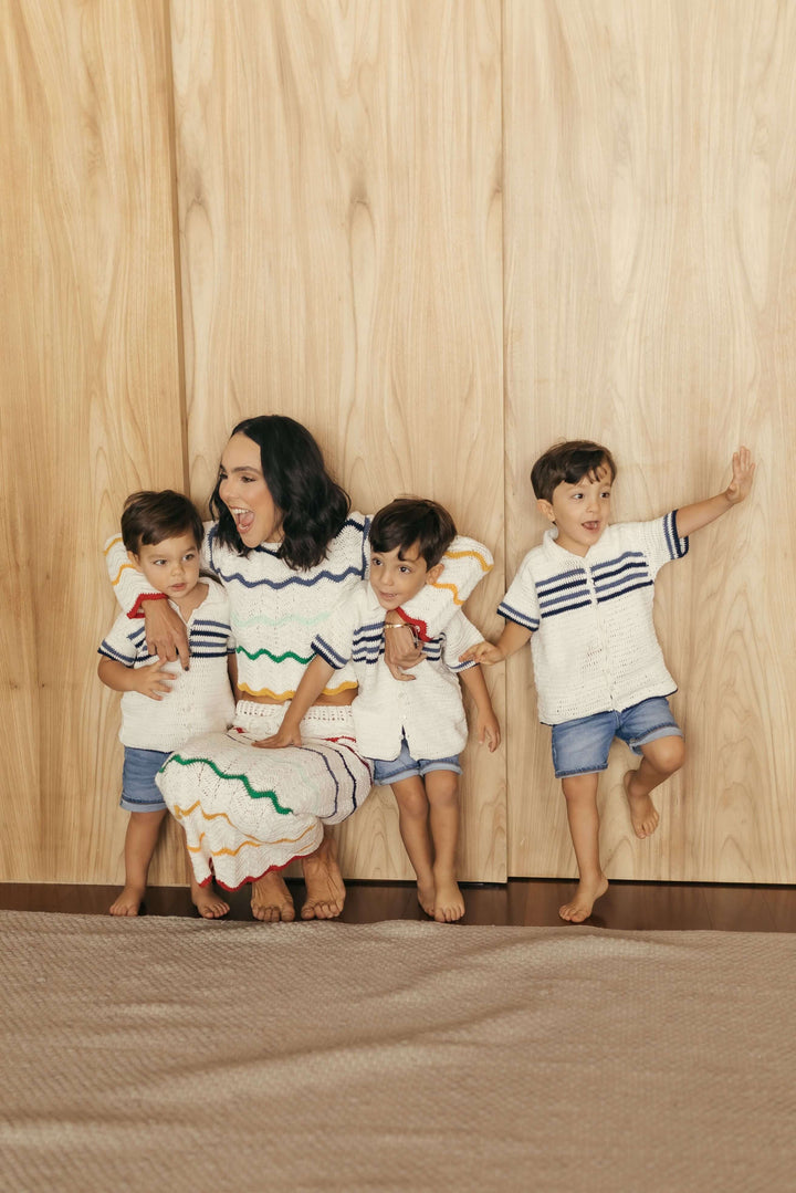 Os modelos possuem 3 anos e vestem camisa tamanho 4 anos.