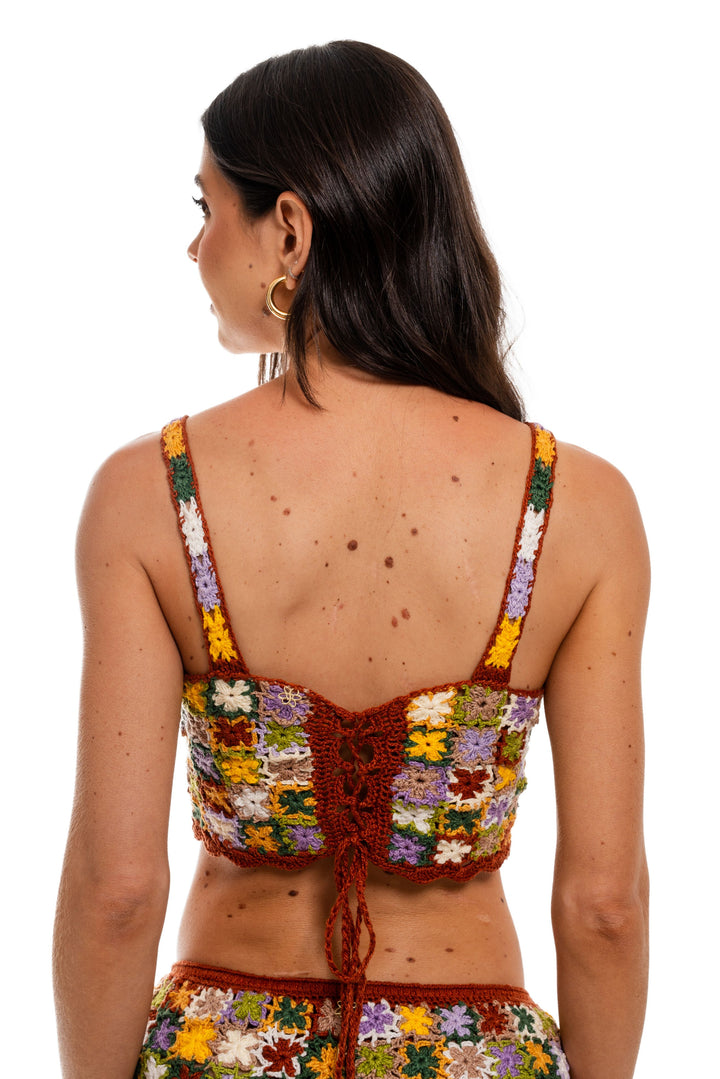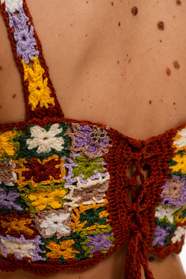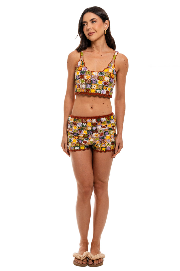 Cropped feito à mão em crochê, composto por mini flores coloridas costuradas uma a uma manualmente.