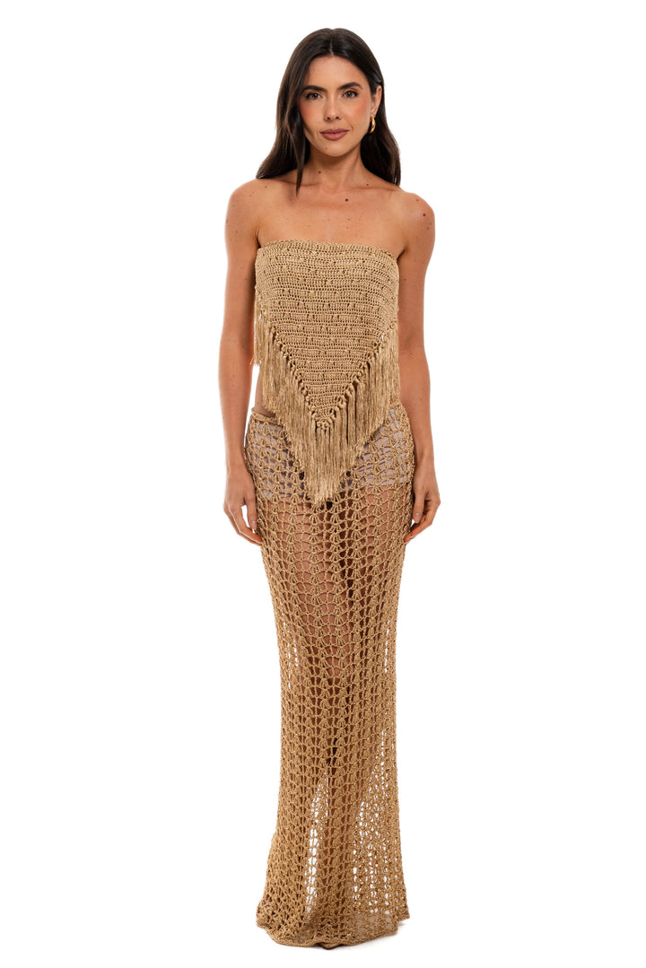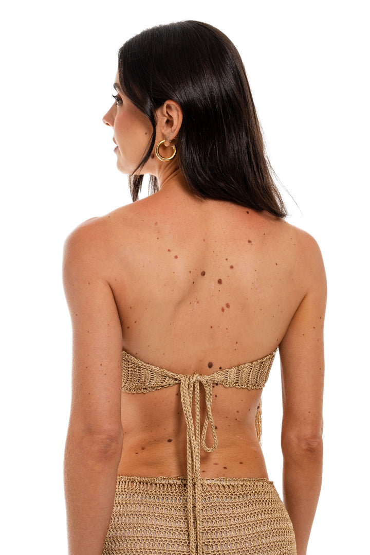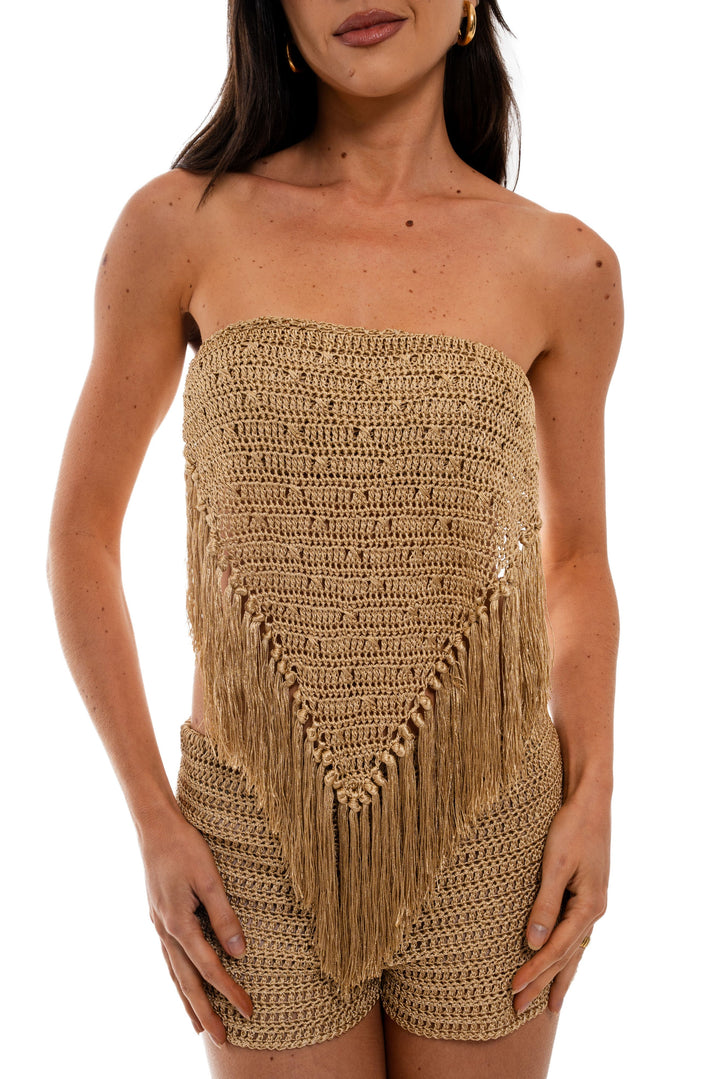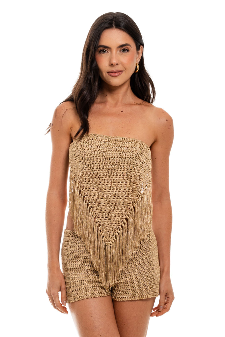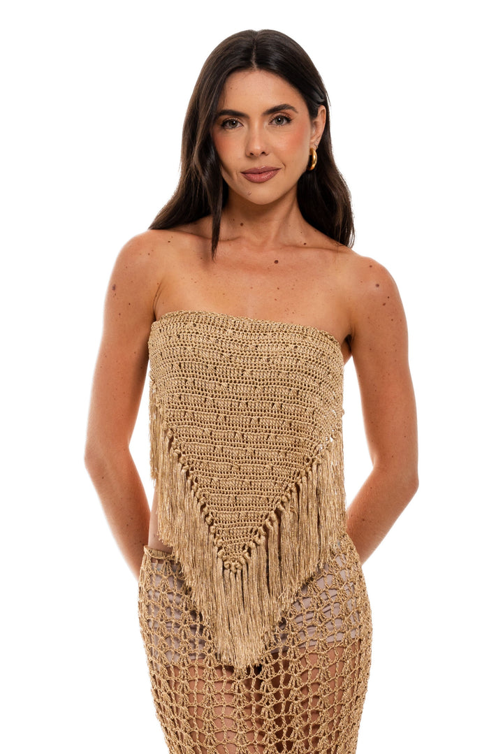 Top modelo “lenço”, feito à mão em crochê com linha de seda cor dourada. A peça possui franjas aplicadas manualmente na parte frontal, criando um desenho em “V” que garante leveza e movimento à peça;