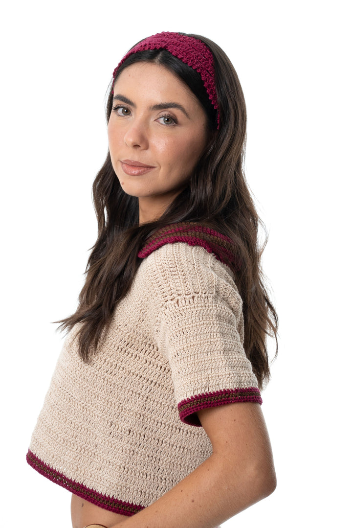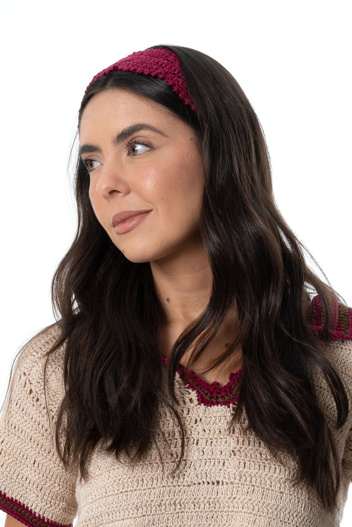 Acessório de cabeça feito à mão em crochê na linha 100% algodão na cor marsala.