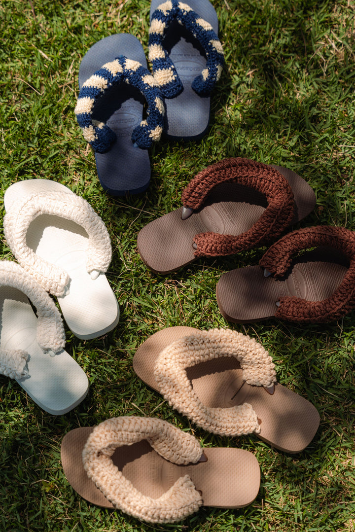Os chinelos da Satú são feitos com havaianas originais, no modelo tradicional (de tira grossa) e com as alças revestidas em crochê feito à mão na cor marrom.