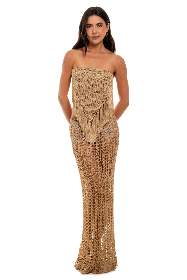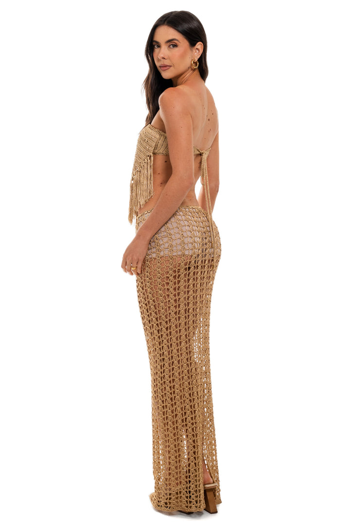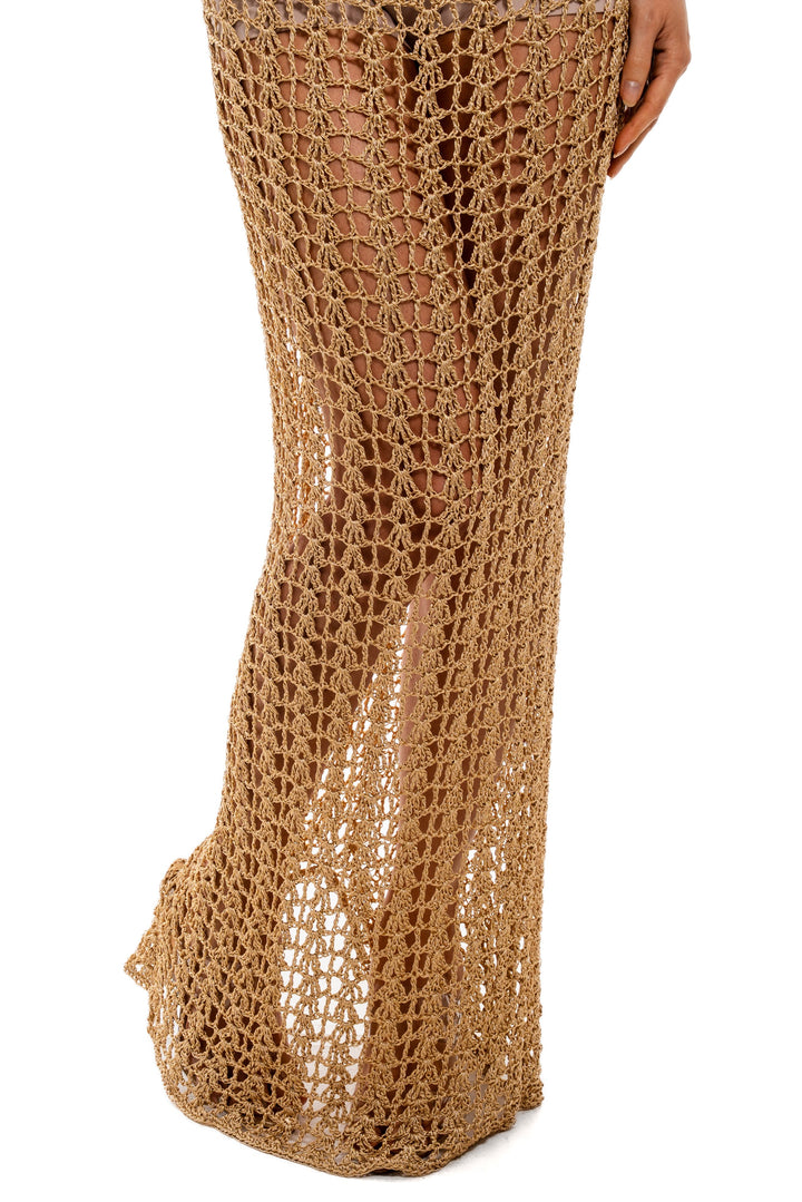 Saia longa feita à mão em crochê com linha de seda dourada.