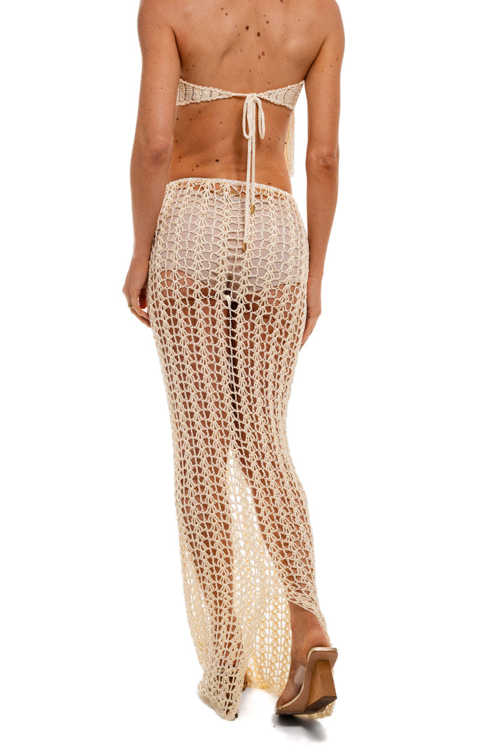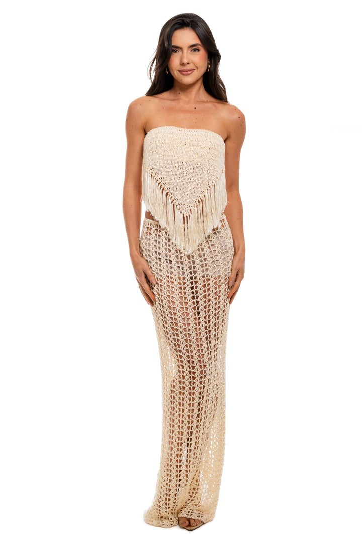 Saia longa feita à mão em crochê com linha de seda off-white.