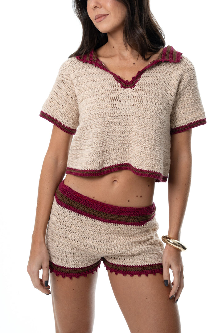 Short feito à mão em crochê, na linha de cor bege e acabamento nas cores marsala e marrom.