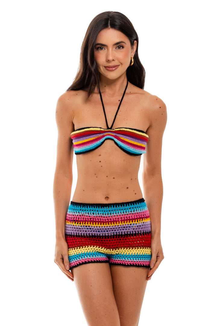 Short feito à mão em crochê, com estampa de listras coloridas e comprimento curto.